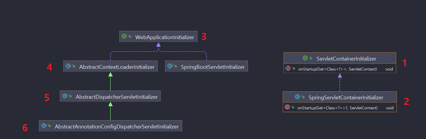 Spring으로 코드 기반 설정이 가능한 SpringServletContainerInitializer 클래스는 ServletContainerInitializer 인터페이스를 구현합니다. SpringServletContainerInitializer 는 컨테이너 시작 시, 서블릿 호환 컨테이너가 로드하고 초기화되며 onStartup() 메서드를 호출합니다.(스프링 웹 모듈 JAR가 클래스 파일에 존재하는 경우) 이 때 @HandlesTypes에 있는 WebApplicationInitializer 구현체를 자동으로 검사합니다. ServletContainerInitializer와 WebApplicationInitializer를 연결해주는데 ServletContext를 WebApplicationInitializer 구현체에서 초기화하고 위임하는 책임이 있습니다. 2개 모두 onStartup() 메서드가 있어 내부적으로 굉장히 유사합니다.