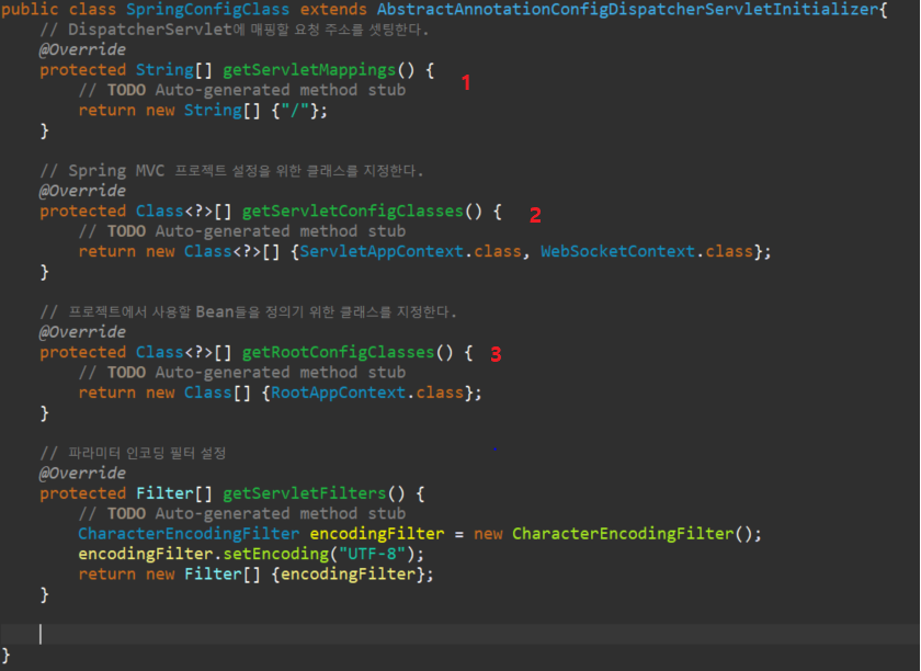 이제 개발환경에 따라 DispatcherServlet을 등록해야 합니다.WebApplicationInitializer을 구현하거나, AbstractAnnotationConfigDispatcherServletInitializer을 구현하면 됩니다. 번호순서에 따라 3번을 확인하고 다음에 6번을 하겠습니다.
