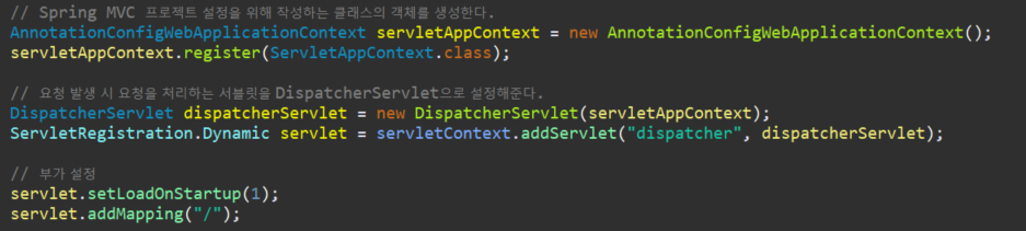 servletAppContext 객체의 생성은 곧 Spring Container의 생성이며 DispatcherServlet이 요청을 받아들이도록 해당 servlet을 등록합니다. 특히 addServlet()하는 servletContext는 해당 onStartup(ServletContext servletContext) 의 매개변수입니다. 그래서 요청한 servletContext들은 DispatcherServlet에서 관리합니다. 아래의 setLoadOnStartup(1)는 servlet 중에 로딩 순서를 첫번째로 하겠다, addMapping("/")은 모든 경로로 요청하는 사항에 대해서 처리하겠다는 의미입니다.