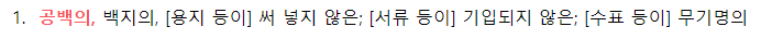 Blank는 공백이라고 나와 있습니다. 써 넣지 않은, 기입되지 않은 등의 설명이 개발자 입장에서도 우리가 유효성을 검사하는 바와 가장 맞아떨어지는 설명입니다. 이 때 공백이라는 빨간 글씨처럼 " "은 Blank의 범위에 포함됩니다. 즉, 꼭 기입되어야 하는 정보가 있을 때 null, "", " "을 모두 포함하니 필수 필드를 @NotBlank로 설정해서 방지해야 합니다.