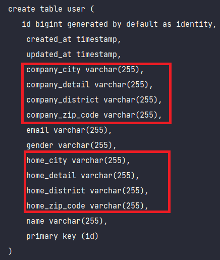 Address 임베디드 타입 칼럼 4개가 2번 생성되어 총 8개의 칼럼이 추가되며, @Column에서 name으로 지정했던 값이 실제 DB 테이블의 칼럼명으로 생성되었다.