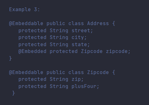 참고로 , Example3 처럼, @Embeddable로 선언한 곳 안에서 @Embedded 사용이 가능하다.