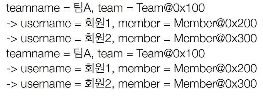 Team은 분명히 2개인데 조회결과 3개가 출력되었습니다. 왜냐하면, 엔티티 컬렉션을 fetch join으로 조회하면 inner join하는 과정에서 데이터가 뻥튀기가 되기 때문입니다. 팀A와 연관관계 있는 Member는 2개이므로 2개 모두 출력됩니다.