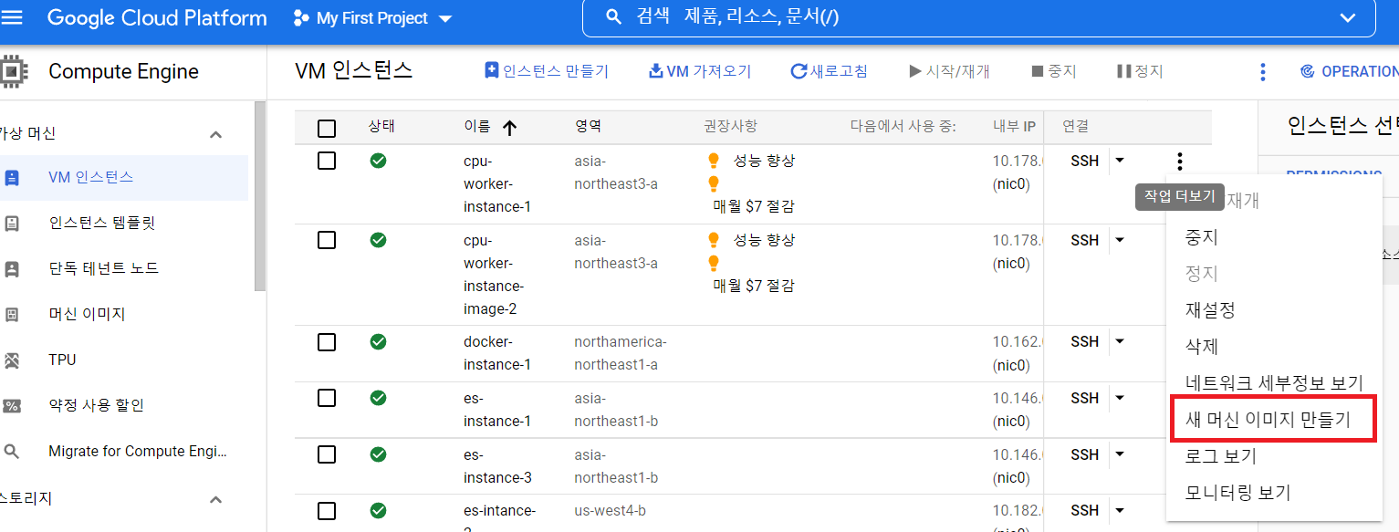머신 이미지에 들어가면, 맨 오른쪽 작업에 [인스턴스 만들기]를 통해 새롭게 만들어주면 됩니다.