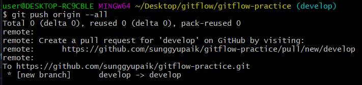 git flow 시작에 따라서, master와 develop branch만 존재합니다. 이는 local repository에만 생성되었기 때문에, origin repository에 develop branch를 등록하기 위해서 push 합니다.