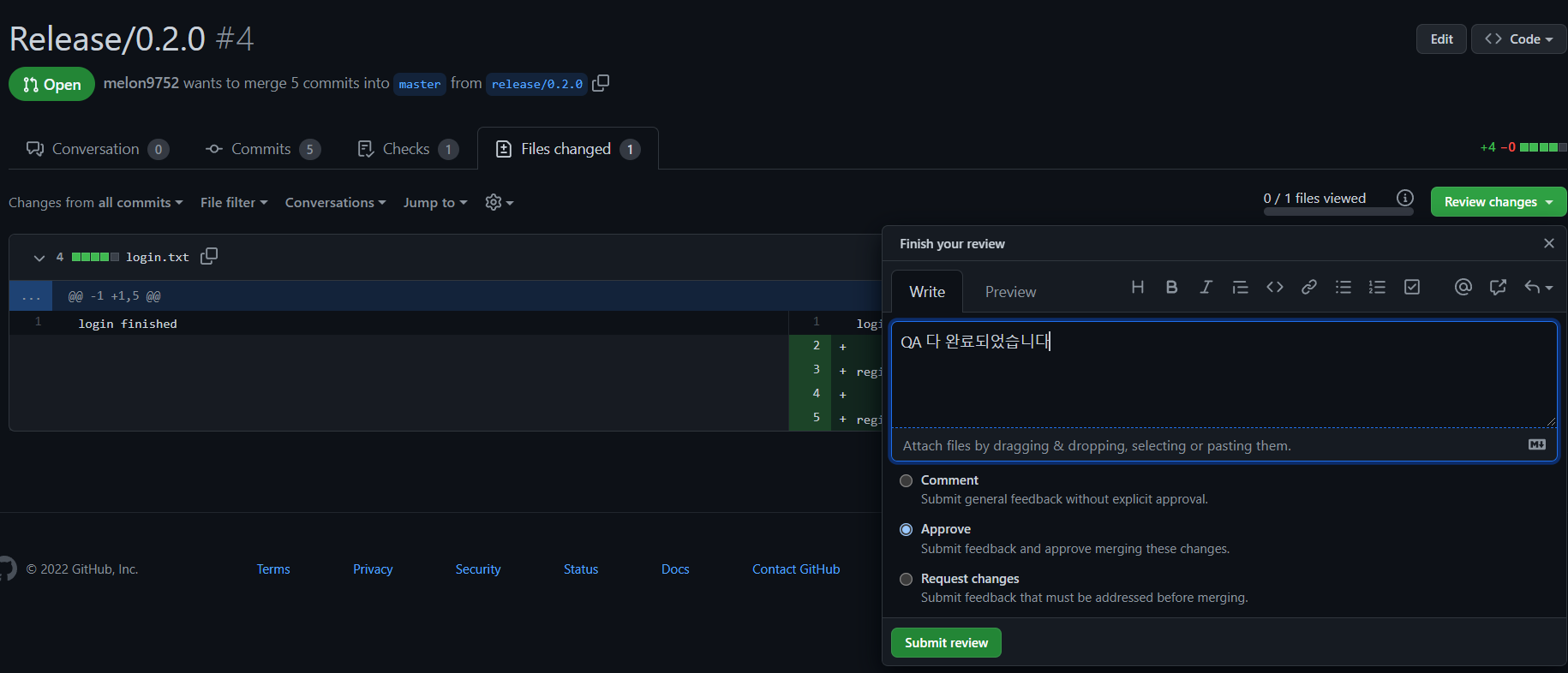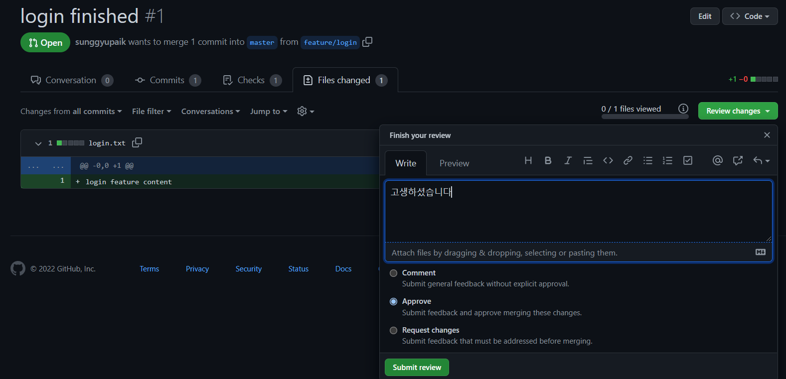 일반적으로 pull request는 develop에 요청을 하기 때문에 왜 master에 하는지 의문이 들 수 있습니다. 이는 다양한 전략을 가져가는 방법 중 하나인데, 당연히 master에서 바로 merge하지 않습니다. approve를 하고, merge하지 않은 상태에서 close를 할 예정입니다. Review changes에서 Approve를 선택하고 리뷰를 남깁니다