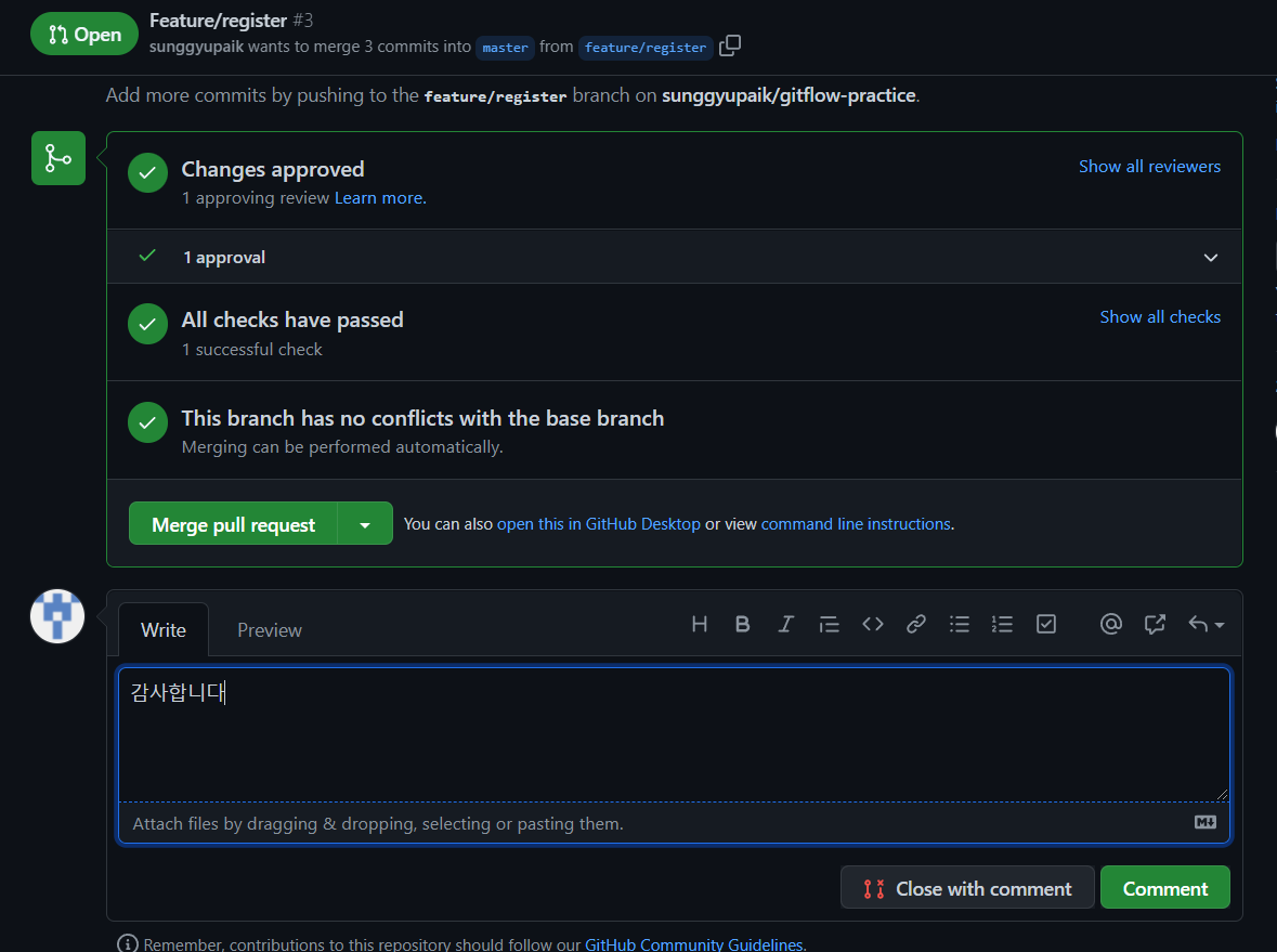 리뷰가 완료되면, pull request를 날린 사용자는 merge하지 않고 close를 합니다.