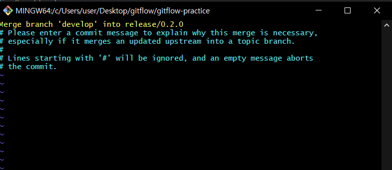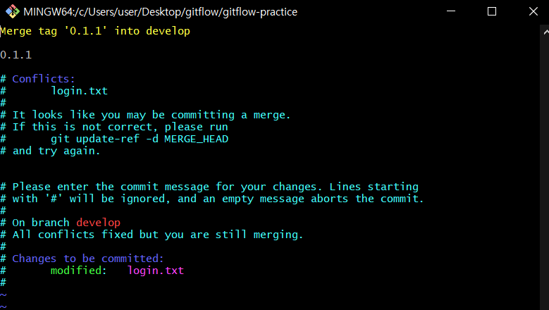 feature를 종료하면 다음과 같이 자동으로 develop에서 merge를 하며, 메시지를 입력합니다