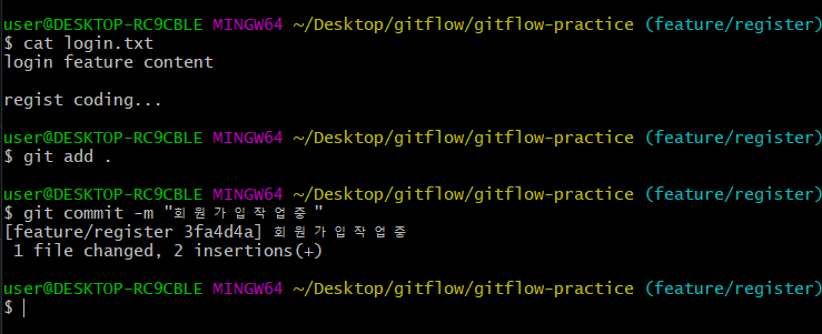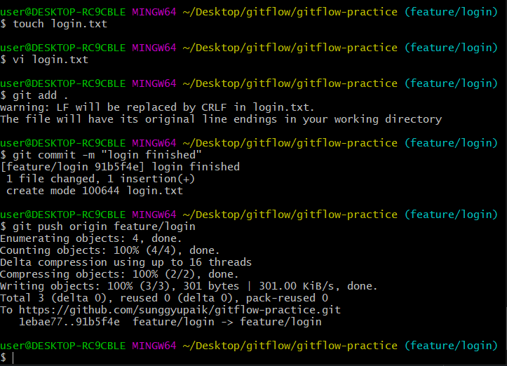 이제 본격적으로 기능구현을 시작합니다. 기능구현은 feature를 사용합니다. login 기능을 만들예정이므로 아래와 같이 시작합니다. 이제 branch는 master, develop뿐만 아니라 feature/login이 추가되었습니다.