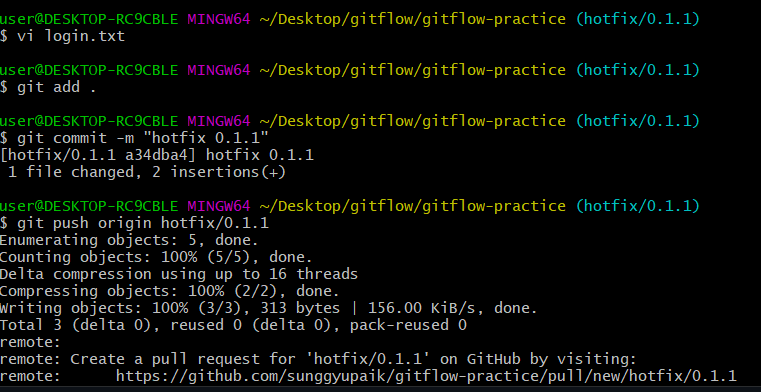 release를 finish하고 master, develop에 반영하기 전에 문제가 발생했습니다. 현재 배포된 버전은 0.1.0으로 hotfix가 필요한 상황입니다. 새로운 hotfix를 생성합니다.