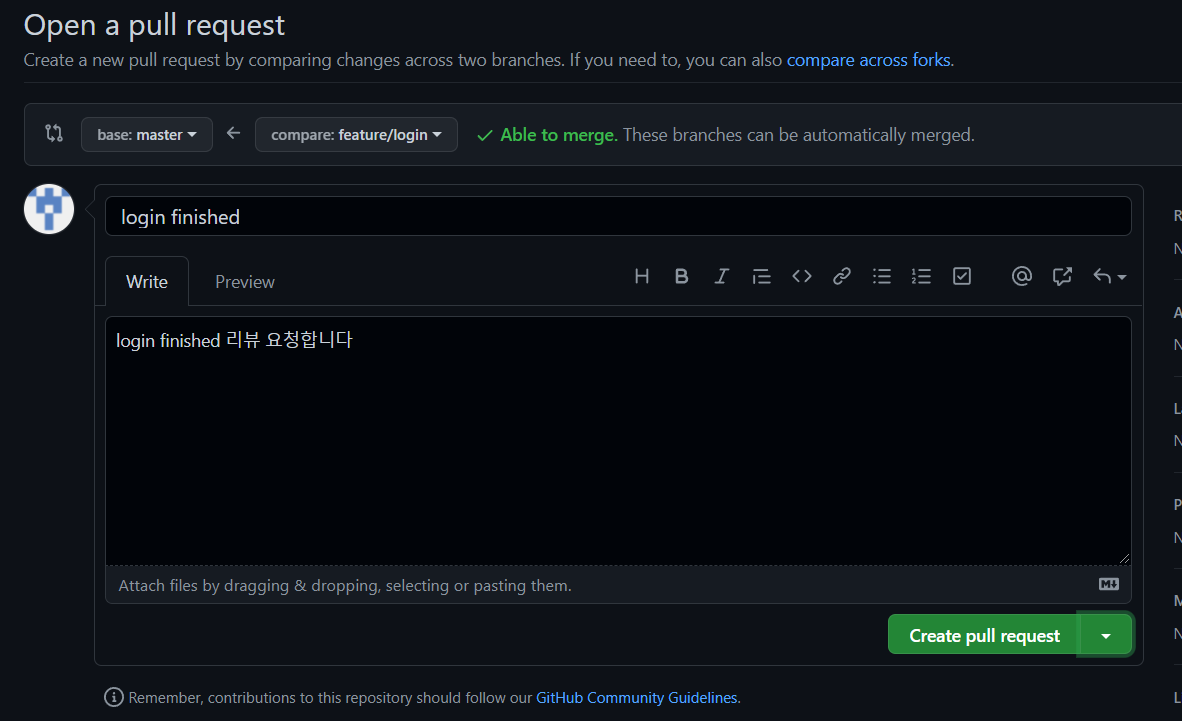 다시 login 기능으로 돌아와서, Pull Request를 진행합니다. [compare]는 local repository에서 pull request를 요청한 branch이고 [base]는 원격 repository에서 pull request를 요청받은 branch입니다. 제목과 내용을 적고 Create pull request를 합니다.