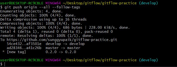 이제 register 기능이 추가된 develop을 배포하고 싶습니다. 그래서 release를 새로 0.2.0으로 생성하고 origin repository에 push합니다.