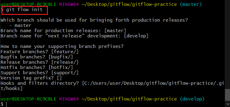 git flow init으로 git flow 를 시작합니다. 항목에는 master, develop, feature, release, hotfix, support가 있으며, 각각은 이름을 수정할 수 있습니다.