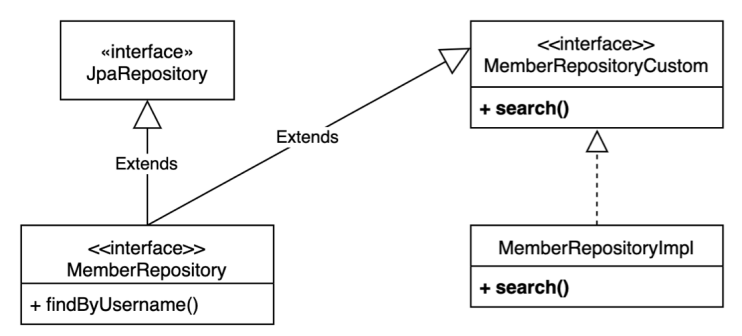 MemberRepository interface는 JpaRepository 이외에도 MemberRepositoryCustm interface를 상속합니다.