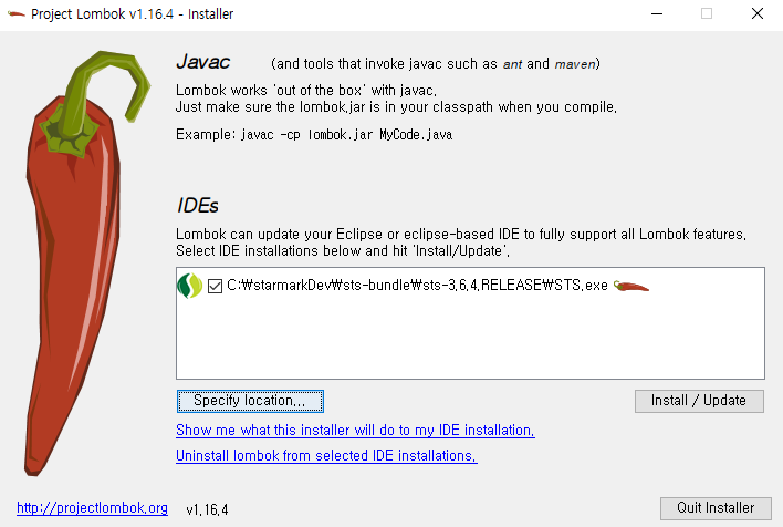 lombok이 설치된 경로로 가서 java -jar로 jar 파일을 실행시킵니다.