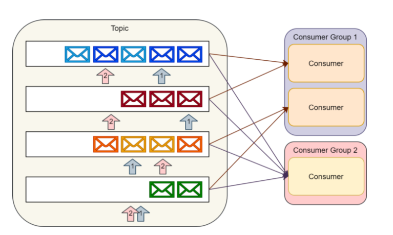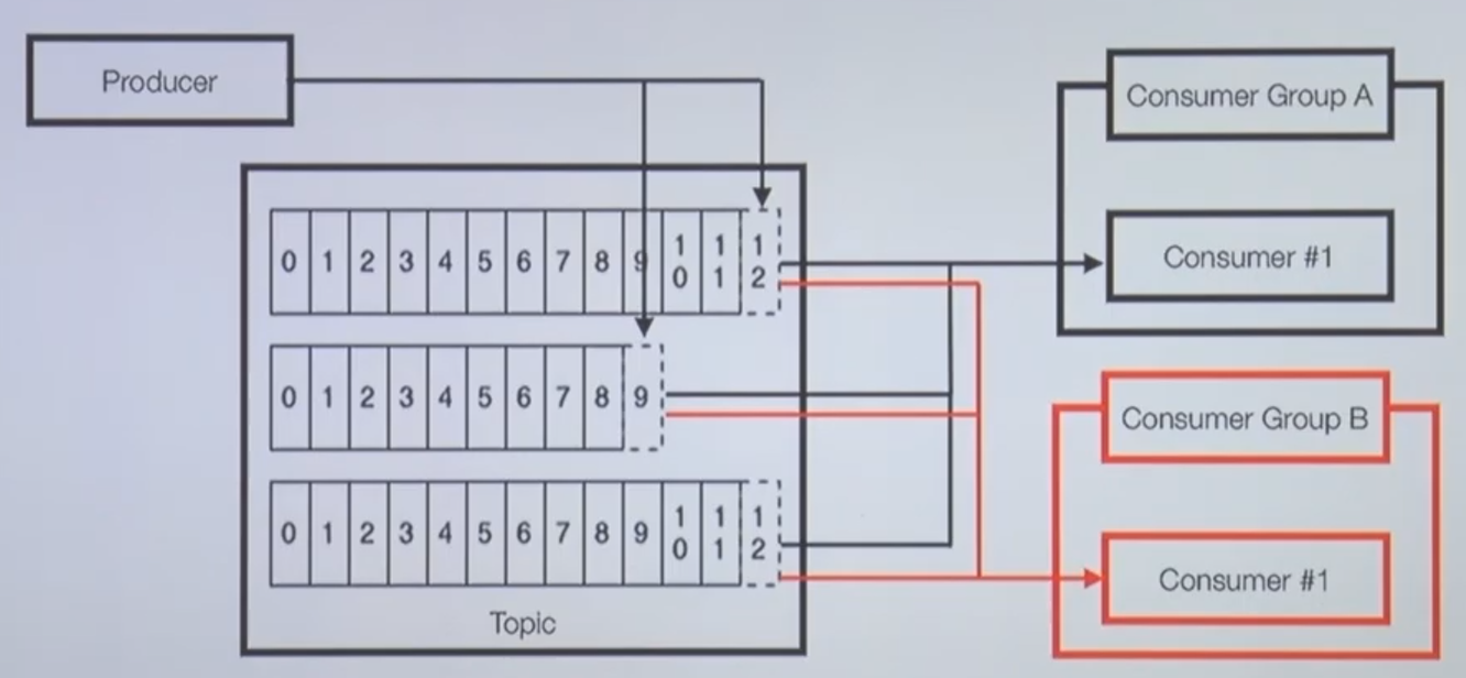 3개의 파티션을 가지는 1개의 토픽이 있고, 2개의 커슈머 그룹이 있다고 가정합니다. 예를 들어, 파티션 맨 위에 있는 것을 파티션 0번이라 했을 때, offset 12번을 처리한다고 하면, 컨슈머 그룹 A에 있는 Consumer1도 읽을 수 있고, 컨슈머 그룹 B에 있는 Consumer1도 해당 메세지를 읽을 수 있습니다.