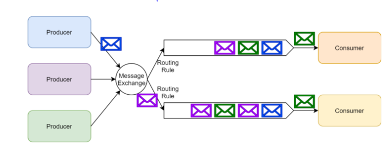 여러개의 Producer와 여러개의 Consumer를 사용할 수 있습니다. 여러개의 Producer가 Message Exchange에 메세지를 보내며, 정해진 규칙에 따라서 큐에 routing이 되고, Consumer들이 메세지를 처리합니다.