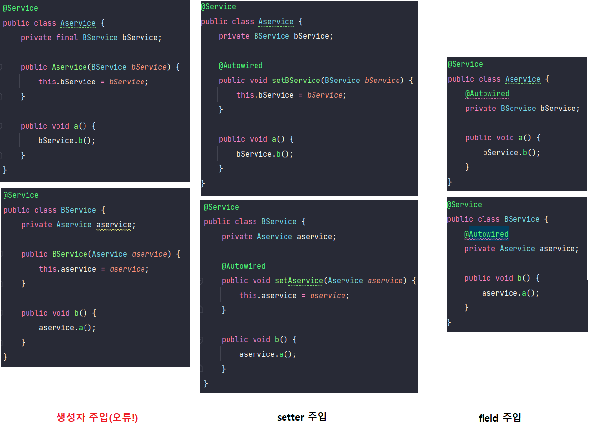 DogsController, DogsService, DogsDao 예시 코드에서 호출 순서를 다시 확인해보면 이유를 알 수 있습니다. 생성자 주입은 매개변수가 있는 생성자를 먼저 호출하고, 생성자의 매개변수에 있는 객체가 의존성 주입이 되어 있어야하기 때문에 서로 의존성 주입을 무한히 요청해서 순환참조 오류를 발생시킵니다.