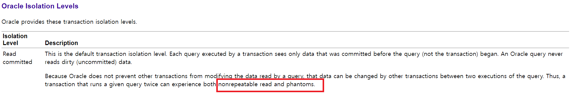 하지만 아래 오라클 공식문서에 나온 것처럼 non-repeatable read와 phantom read 현상에 주의해야 합니다.