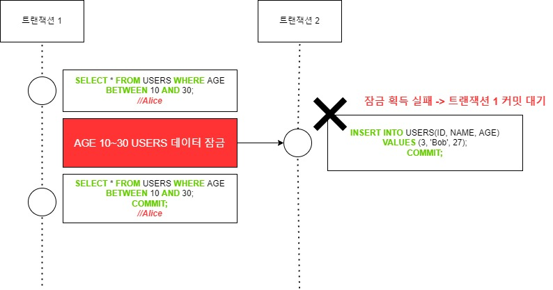 Repeatable read는 특정 스냅샷을 기준으로 트랜잭션을 실행하지만 조건 범위가 있는 SELECT문에는 적용되지 않습니다. 아래는 트랜잭션 1에서 AGE가 10~30 사이인 데이터를 SELECT 했는데, 트랜잭션 2에서 AGE가 27인 데이터를 삽입하고 있습니다.