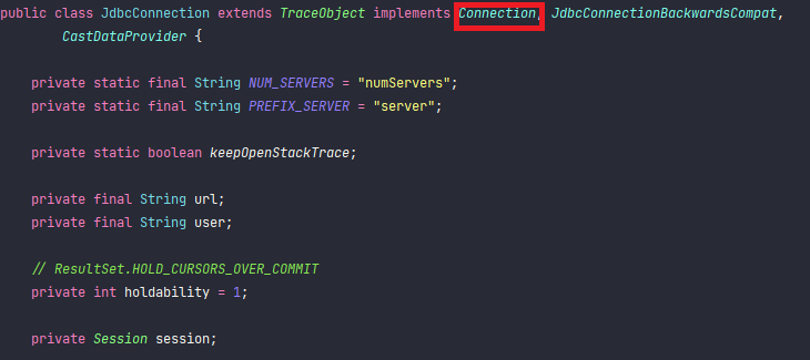 아래는 h2 데이터베이스 라이브러리 내부에 있는 JdbcConnection 클래스로 Connection을 구현하도록 정의되어 있습니다. DriverManager는 해당 클래스 정보를 찾아 h2의 Connection을 만듭니다.
