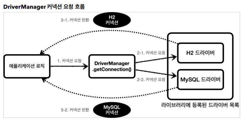 즉, DriverManger.getConnection()을 사용하면, 아래 사진처럼 라이브러리에 등록된 드라이브 중에 내부의 설정된 정보에 따라서 h2 드라이버를 연결할 수도, MySQL 드라이버를 연결할 수도 있습니다.