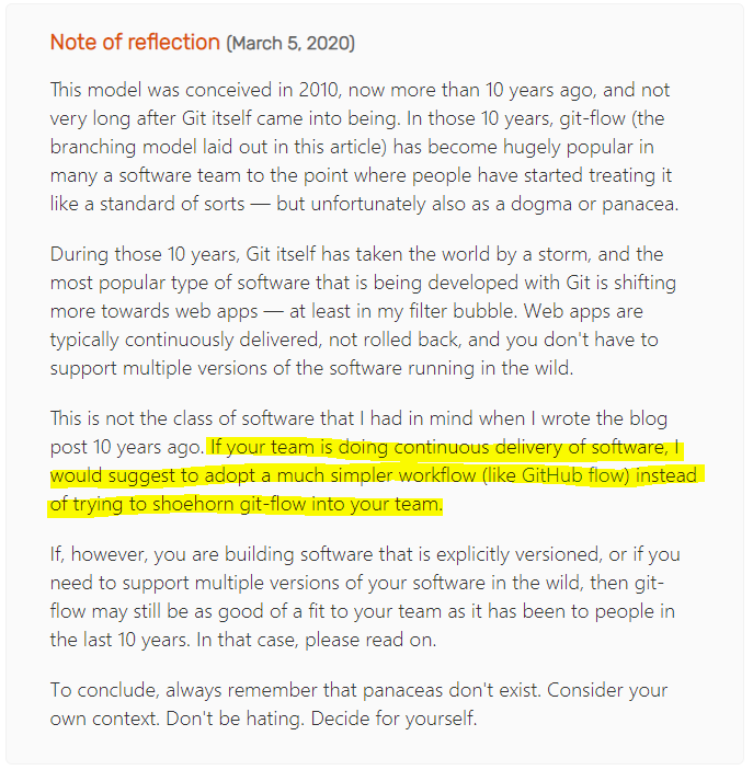 결론적으로 이를 의식했는지, 2020년 Git Flow 소개 글에서는 아래와 같이 추가 코멘트를 남겼습니다.
