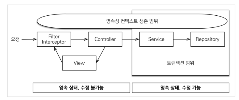영속성 컨텍스트가 계속 생존하기 떄문에 @Transactional이 붙어있는 서비스 레이어가 종료되어도, Controller나 View에서 지연로딩을 지원합니다.