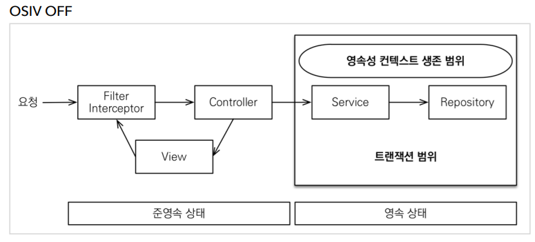 OSIV를 사용하지 않는다는 것은, 생성된 세션의 영속성 컨텍스트를 요청의 라이프 사이클에 묶지 않고, 트랜잭션 범위에만 한정시킨다는 의미입니다.