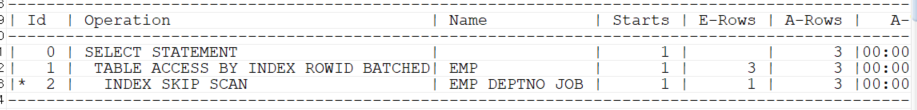 SELECT /*+ gather_plan_statistics INDEX_SS(EMP EMP_DEPTNO_JOB) */