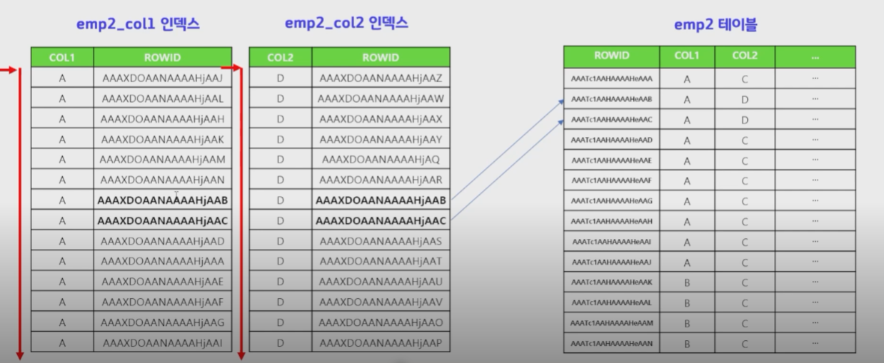 따라서, 아래와 같이 emp2_col1 인덱스와 emp2_col2 인덱스에서 해당하는 ROWID를 먼저 찾고 emp2 테이블에 액세스 합니다. 이전에 각 인덱스 테이블과 emp2 데이블의 비교를 위해 수십만 번의 액세스를 해야 했지만 merge scan으로 2번만 emp2 테이블에 액세스 하면 됩니다.