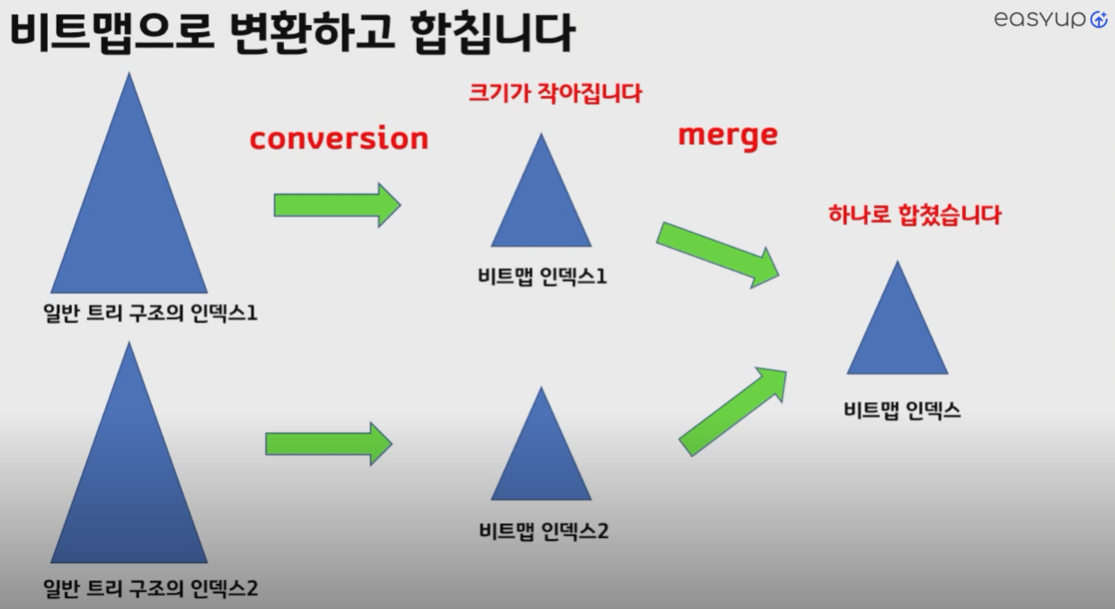 index merge scan에서 한 단계 더 발전해서 인덱스 테이블을 비트맵 인덱스 테이블로 변환해서 스캔하는 방법입니다.