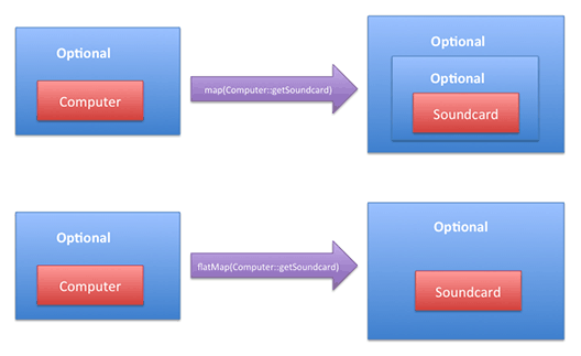 computer.map(Computer::getSoundcard)로 Optional<Optional<SoundCard>>가 되어 Optional 중첩이 됩니다. 하지만 computer.flatMap(Computer::getSoundcard)는 Opional<SoundCard>로 변환합니다. 왜냐하면 flatMap은 map처럼 기존에 각각의 스트림을 변환하는 대신에, 모든 스트림을 하나의 스트림으로 "평평하게" 새롭게 만들기 때문입니다.