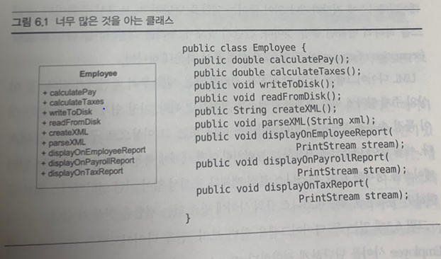 그림 6.1을 보겠습니다. 이 클래스는 너무 많은 정보를 가지고 있습니다. 임금과 세금을 계산하는 방법, 자신을 디스크에 저장하거나 읽어 오는 방법, 그리고 자신을 XML 입출력하는 방법, 다양한 보고서 형식으로 출력하는 방법도 압니다. '부숴지기 쉬운 상황' 이 느껴지지 않나요?