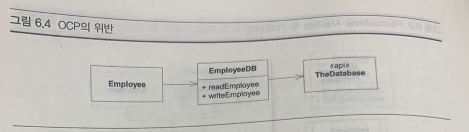 그림 6.4를 보면, EmployeeDB 데이터베이스 퍼사드(facade)를 통해 Employee를 다룹니다.(Employee는 EmployeeDB에 의존합니다) EmployeeDB 는 데이터베이스 API를 직접 다룹니다. 즉, EmployeeDB의 구현이 변경되면 Employee도 다시 빌드해야 할 수도 있으므로 OCP를 위반합니다. Employee는 EmployeeDB를 통해 데이터베이스 API와도 강하게 결합되어 묶인 셈입니다. 심지어, Employee 클래스를 포함하는 시스템은 반드시 TheDatabase API까지 포함합니다.
