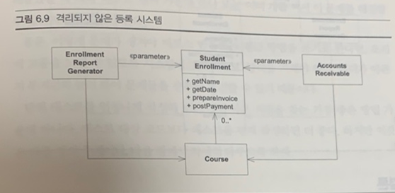 예를 들어, 그림 6.9에 나온 강좌 등록 시스템을 보겠습니다. 이 다이어그램에는 StudentEnrollment(학생 등록)을 사용하는 두 클라이언트가 있습니다. EnrollmentReportGenerator(등록 상황 보고서 생성자)가 preparedInvoice나 postPayment 같은 메서드는 사용할 일이 없다고 가정해보겠습니다. 마찬가지로 AccountsReceivable(받을 수 있는 계좌)은 getName이나 getDate 같은 메서드를 호출하지 않는다고 가정해 보겠습니다.