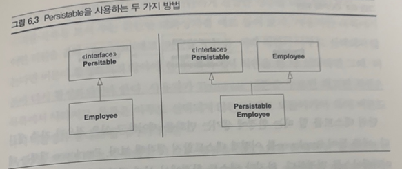 그림 6.3의 오른쪽 다이어그램이라면 Employee는 Persistable에 독립과 동시에 왼쪽 다이어그램과 마찬가지로 Persistable을 사용할 수 있습니다. 또한 PersistableEmployee 인스턴스는 시스템 안에서 Employee 역할도 가능합니다. 즉 Persistable과 Employee의 결합이 있지만, 시스템 영역의 클라이언트들은 이 결합을 모릅니다.