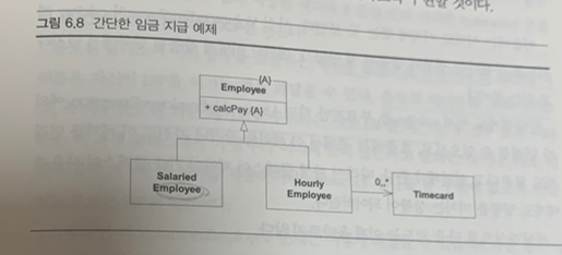 그림 6.8에 나온 임금 지급 애플리케이션에서 Employee는 추상 클래스이며, 추상 메서드 calcPay를 가집니다. SalariedEmployee는 월급을 리턴하도록 calcPay 메서드를 구현합니다. HourlyEmployee는 이번 주 (출퇴근 카드에서 알아낸 근무 시간 수 * 시간당 임금)을 리턴하도록 calcPay 메서드를 구현합니다.