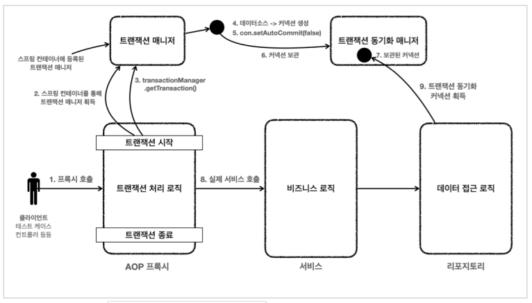 @Transactional으로 프록시 방식의 AOP를 이용한 트랜잭션 작동은 아래와 같습니다. 트랜잭션 시작 시 트랜잭션 매니저는 데이터 소스에서 커넥션을 만들고 트랜잭션 동기화 매니저에 커넥션을 보관합니다. 트랜잭션 로직을 처리할 때 트랜잭션 동기화 매니저에 보관된 커넥션을 사용하고, 트랜잭션을 모두 종료시키고 커넥션을 반납합니다.