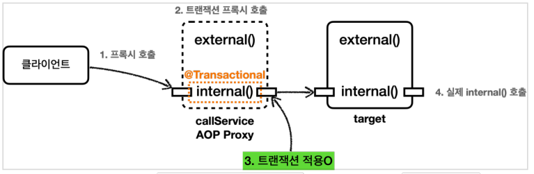 external()을 호출하면, @Transcational이 없기 때문에 callService 프록시는 트랜잭션을 시작하지 않고 external()을 호출합니다. 그리고 internal()을 호출하는데 비록 internal()에 @Transactional이 선언되어 있더라도, 여기서는 internal()이 트랜잭션에 적용되지 않습니다. 왜냐하면 external()이 실행된 이후 internal()은 this.internal() 호출되는데 this는 현재 객체를 가리키므로 callService AOP Proxy가 아닌 target에서 바로 internal()이 실행되기 때문입니다. 이는 callService 프록시를 전혀 거치지 않고 바로 target에 있는 internal()을 실행합니다.