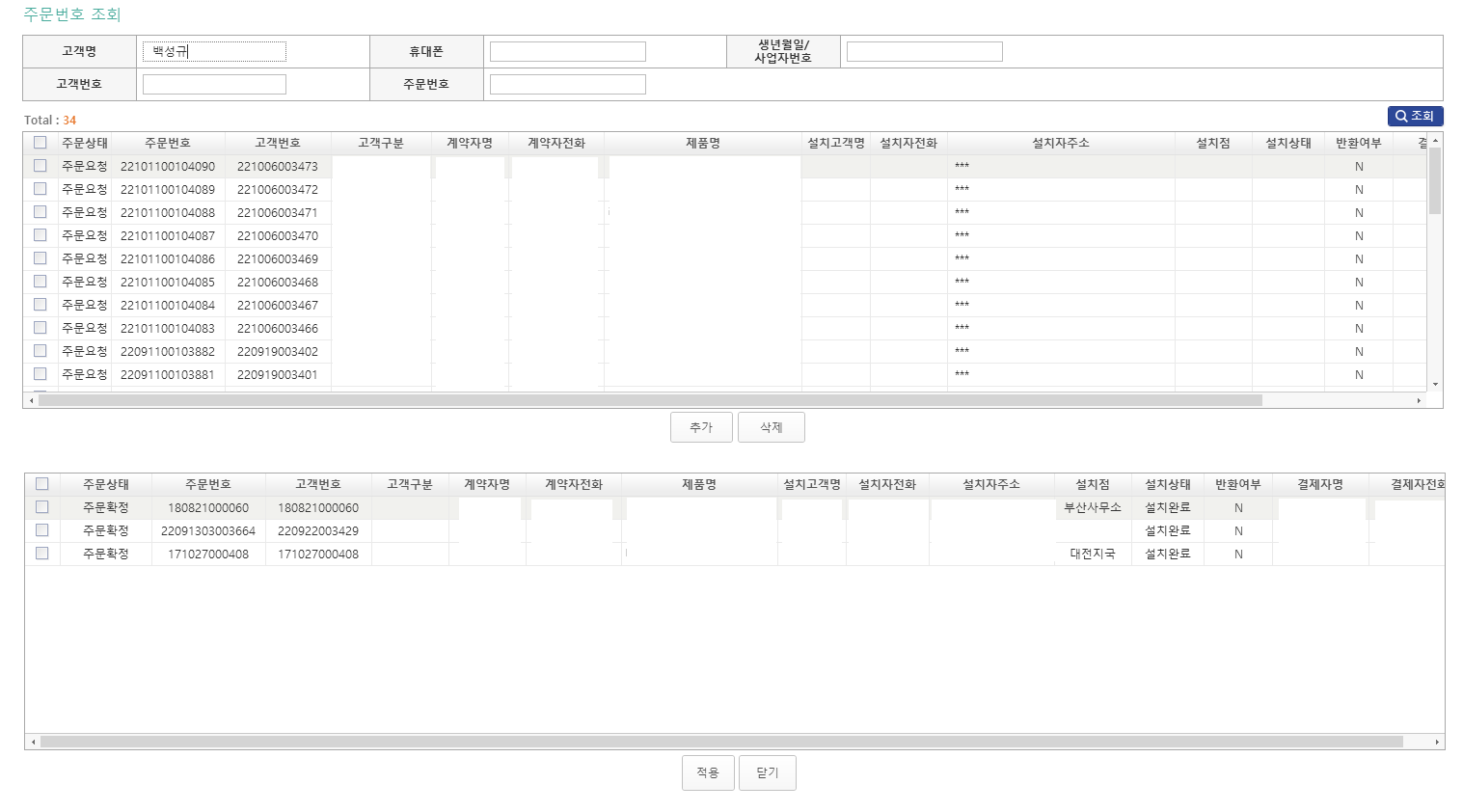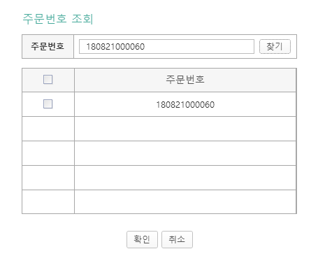 하지만 개선 후에는 오른쪽 화면과 같이 대표 그룹 주문번호 팝업에서 원하는 모든 주문번호를 추가하여 한번에 등록할 수 있습니다. 위에는 원하는 주문번호를 선택할 수 있는 화면이고 아래는 그룹 전송에 추가된 주문번호입니다.