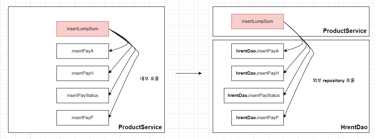 해결할 수 있는 방법은 여러가지가 있는데 가장 좋은 방법은 별도의 클래스로 정의해서 호출하는 것입니다. 별도의 클래스로 호출하면 다시 프록시를 통해 호출되기 때문에 정상적으로 로그가 찍힙니다. 위의 코드는 서비스 클래스에 정의되어 있는데 별도의 서비스 클래스를 만들지 않고 바로 repository에서 호출하는 방법을 택했습니다. 어차피 각 메서드는 repository에 저장하는 역할만 하고 있습니다. 따라서 좀 더 손쉽게 문제를 바로 해결했습니다.
