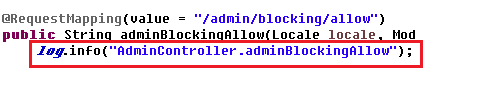 Front, Admin 2개의 프로젝트가 있는데 이 중에 Admin 프로젝트는 로그가 아래처럼 각 Controller의 시작시에 찍혀 있습니다. 이는 비지니스 로직에 의미없는 불필요한 코드 추가이며 새로운 메서드가 생성될 때마다 수동으로 작성해야 합니다. 또한 로그 규칙이 변경된다면 모든 메서드의 로그 코드를 수정해야 하는 불편함이 있습니다.