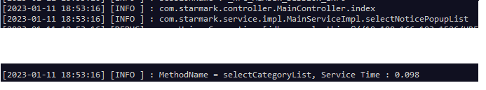 MainController 클래스의 index 메서드가 실행되어 MainServiceImpl 클래스의 selectNoticePopupList 메서드가 실행된 것을 알 수 있습니다. 또한 해당 메서드는 0.098초가 걸렸습니다. 이제 비지니스 로직의 흐름을 쫓아가기가 훨씬 수월해졌습니다.