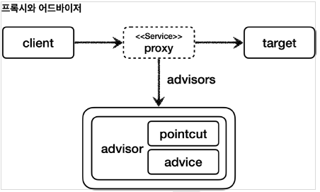 또한 프록시가 호출되었을 때 pointcut을 사용해서 advice를 적용할지 말지 검사합니다. 조건에 만족하면 프록시는 advice를 적용하고 나서 target을 호출합니다.(프록시는 advisor를 검사하여 advice, pointcut을 알 뿐만 아니라 실제 호출해야 하는 target도 알고 있습니다.)