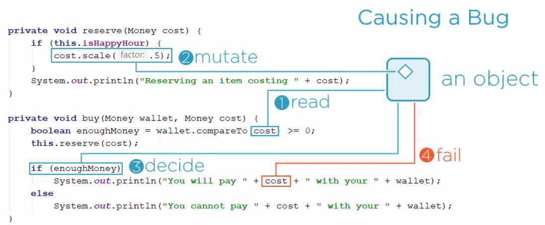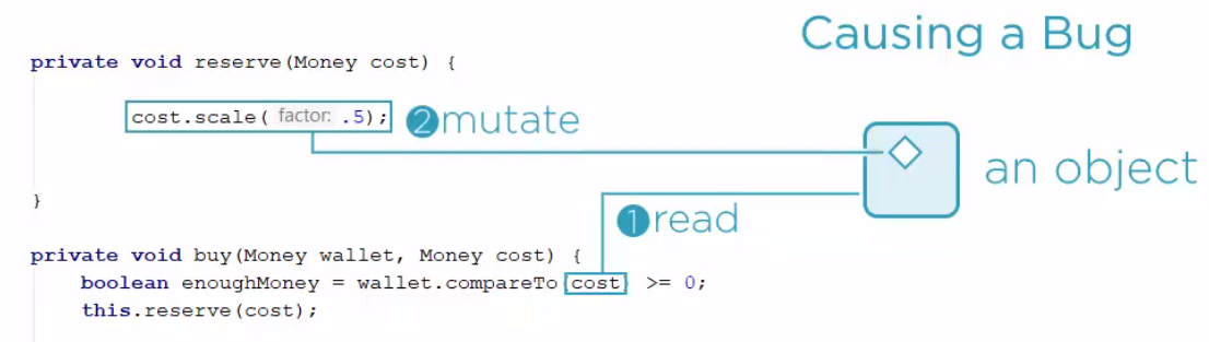 해당 오류를 피하는 간단한 방법은 공유 객체를 변경하지 않는 것입니다.(불변 클래스 만들기) 메서드 매개변수는 공유 참조의 전형적인 예시입니다. cost 매개변수는 외부에서 전달된 참조입니다. reserve() 메서드는 여전히 동일한 객체에 유효한 참조를 할 가능성을 가지고 있습니다. 위험을 줄이기 위해서느 이 메서드는 매개변수 변경을 막아야 합니다.