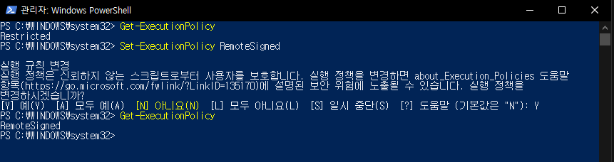 따라서 스크립트를 실행할 수 있는 RemoteSigned로 정책을 변경합니다.